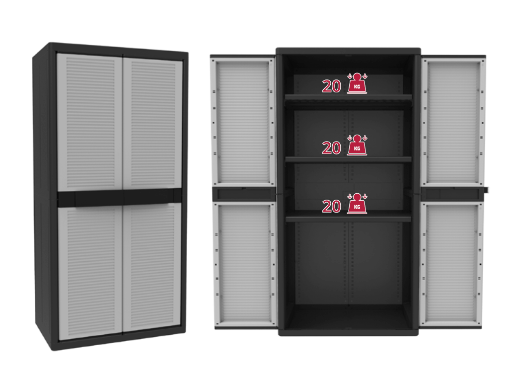 Plastové skříně Jumbo italské výroby jsou oblíbené pro svou snadnou montáž, ke které není potřeba nářadí. Další jejich výhodou jsou snadno posunovatelné poličky i přizpůsobení na visací zámek.