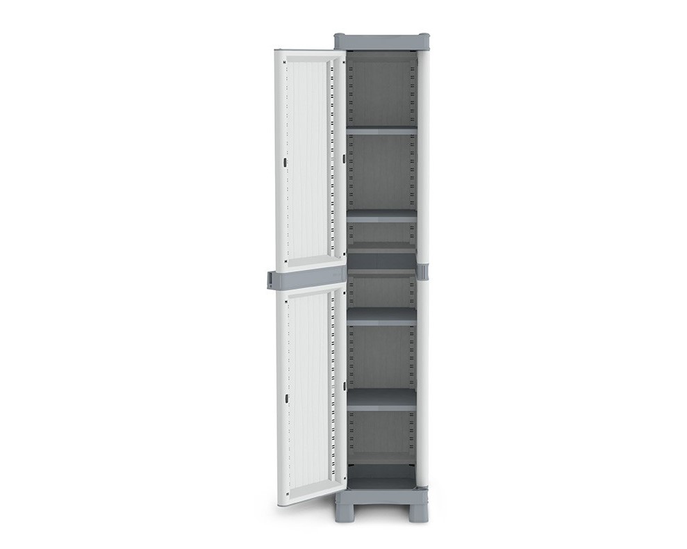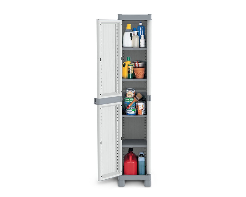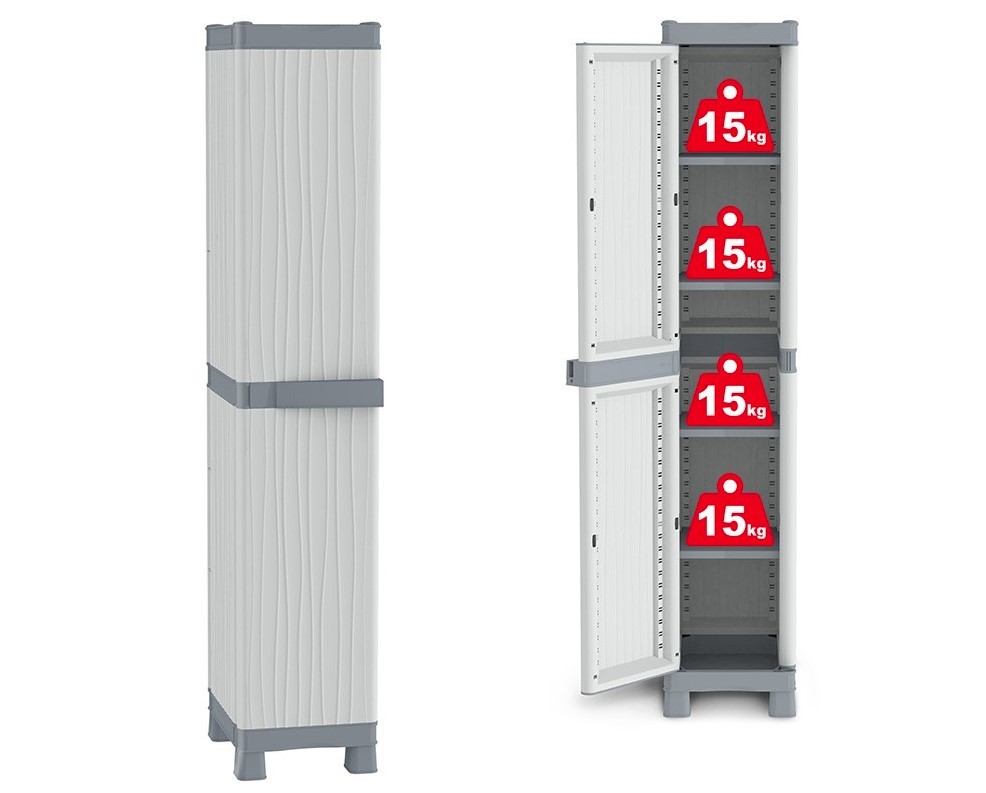 Plastová skříň se 4 výškově nastavitelnými poličkami, každá o nosnosti 15 kg. Rozměrově se tato plastová skříň vejde i do opravdu malých prostor. Skříň je vhodná do garáží, na kryté terasy a chodby. Skříň může sloužit jako skříň na nářadí, skříň do garáže, skříň do vlhkých sklepů.