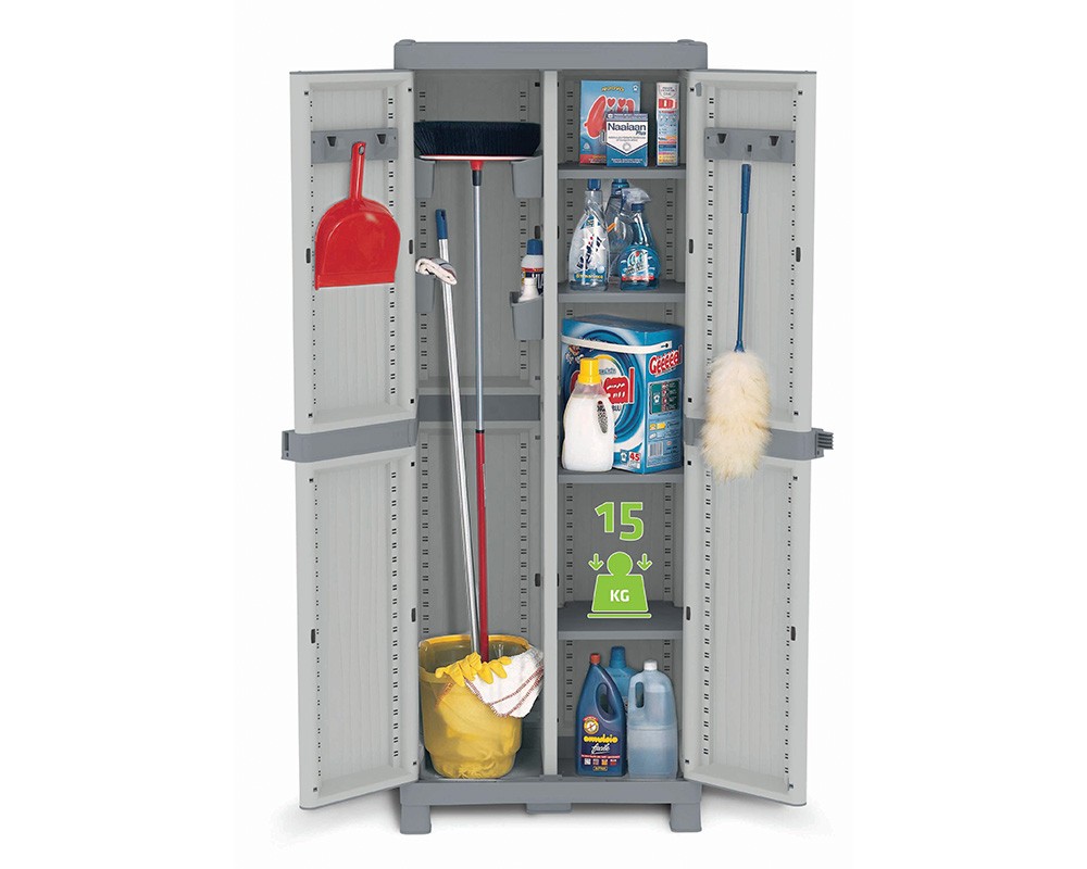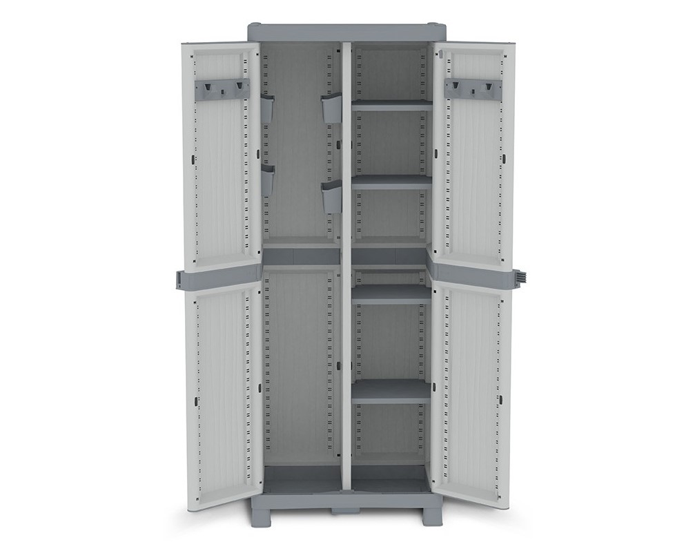 Plastová skříň s dělící stěnou a 4 výškově nastavitelnými poličkami, každá o nosnosti 15kg. Skříň je vhodná do garáží, na kryté terasy a chodby. Prostor skříně je rozdělen stěnou, díky které můžete skříň využít i pro prostorově náročnější předměty. Skříň může sloužit jako skříň na nářadí, skříň do garáže, skříň do vlhkých sklepů.